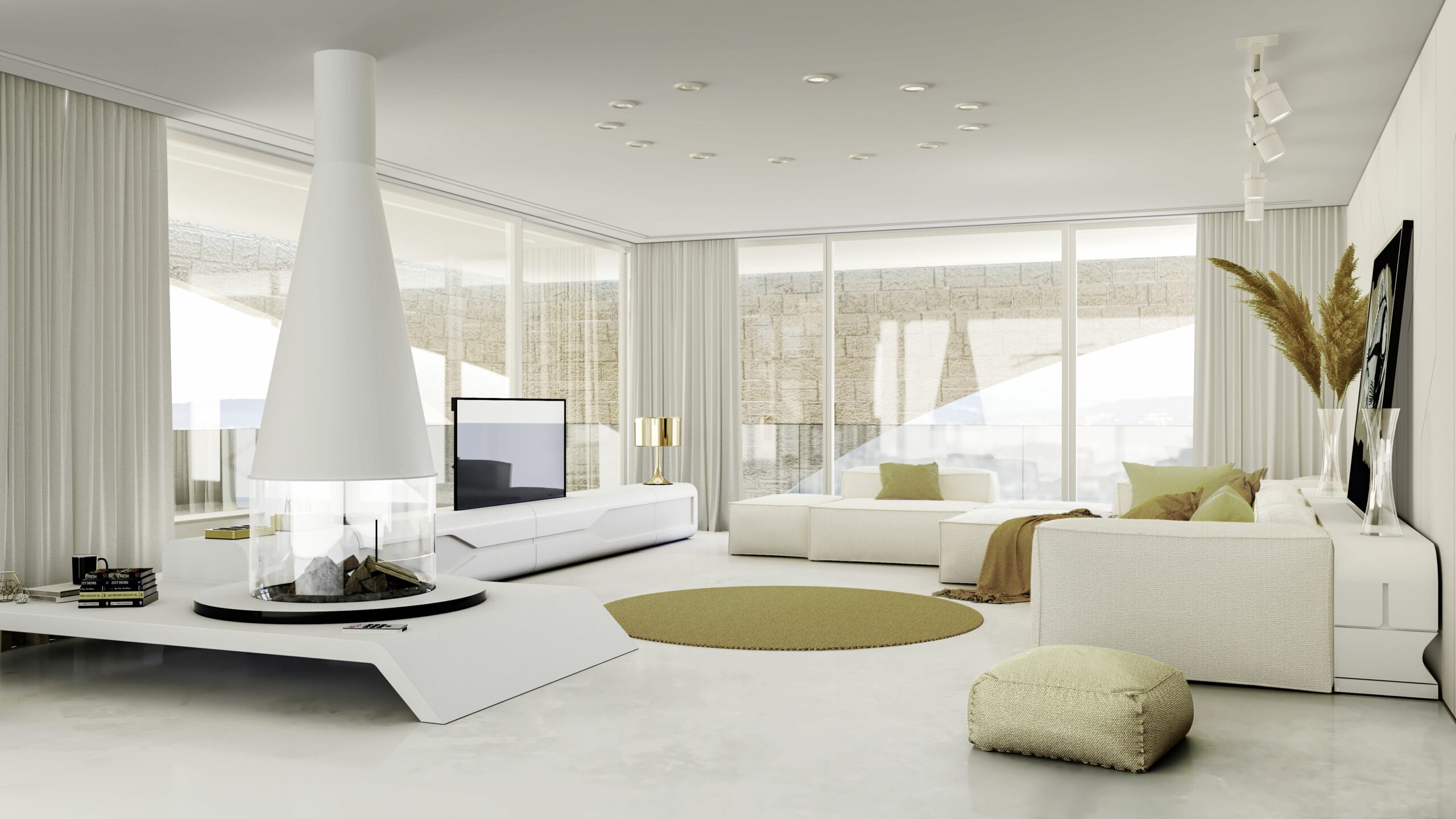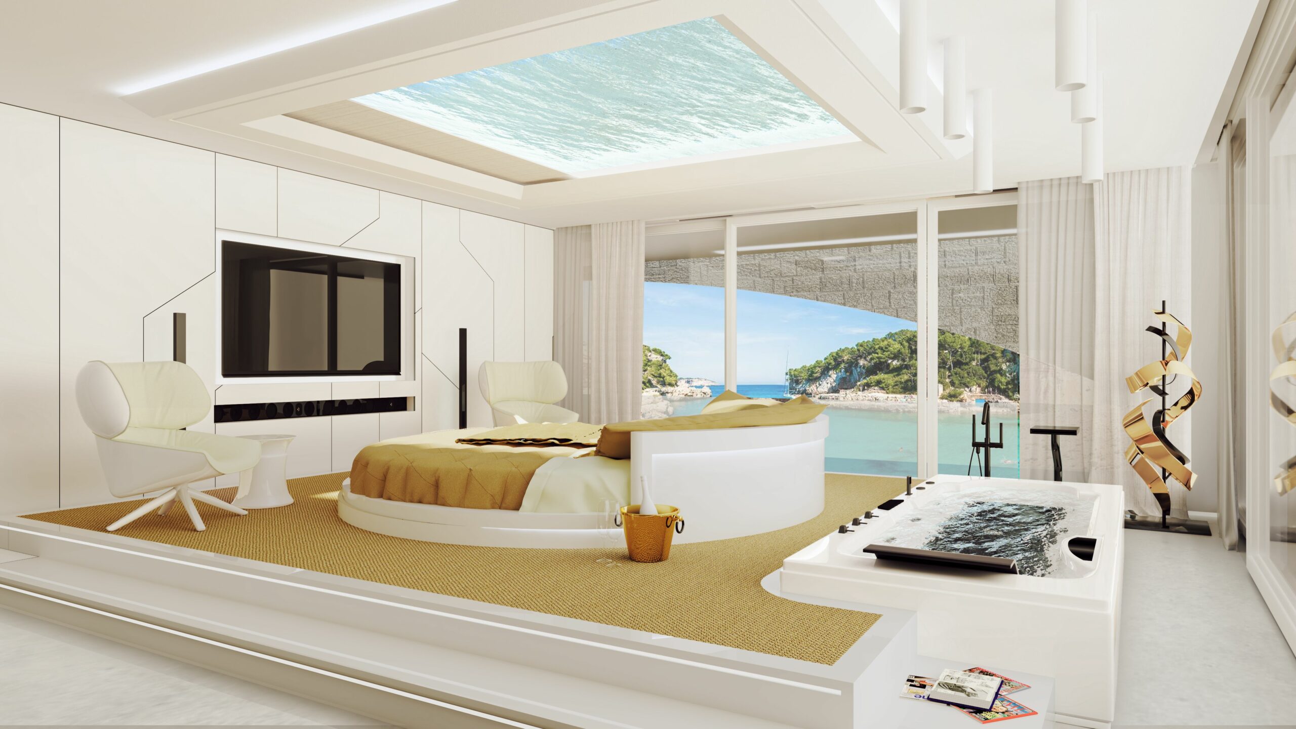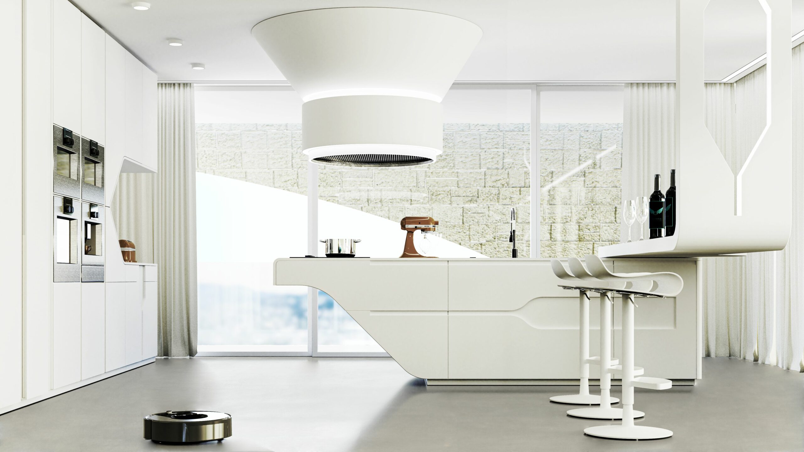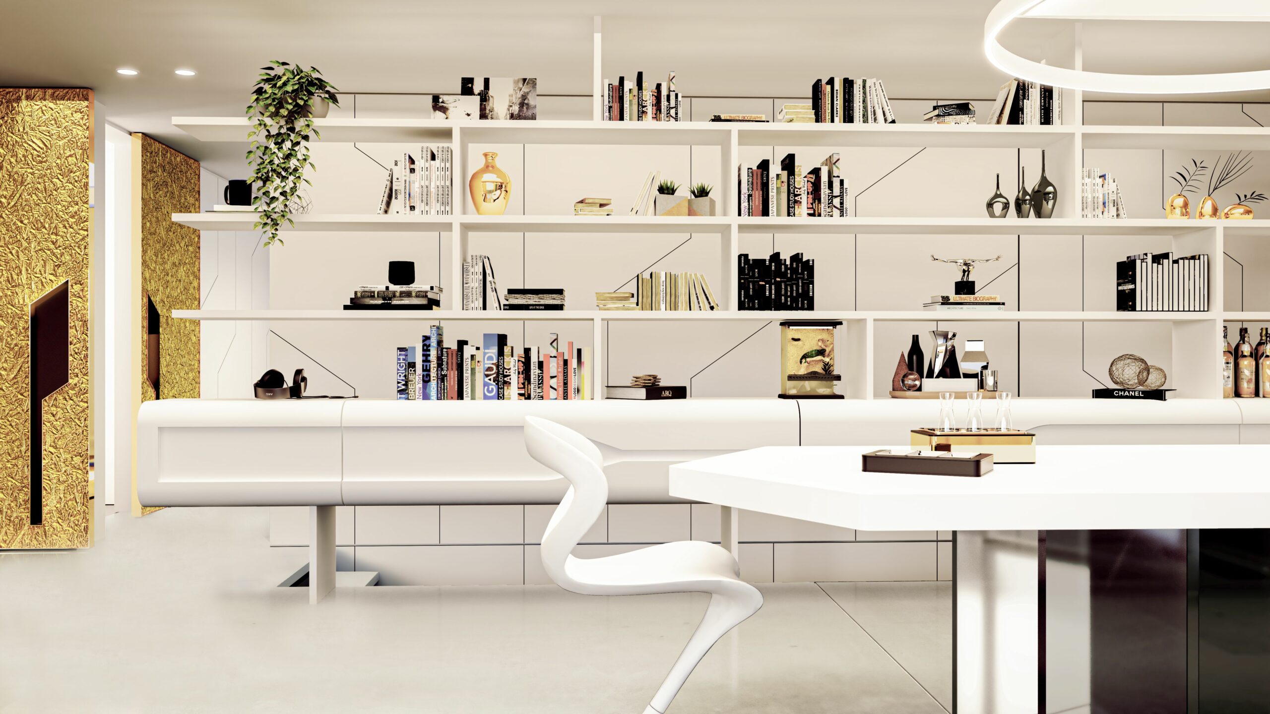 Gli interni sono caratterizzati da linee pulite e minimaliste, con pavimenti in resina e mobili di forme futuristiche.
