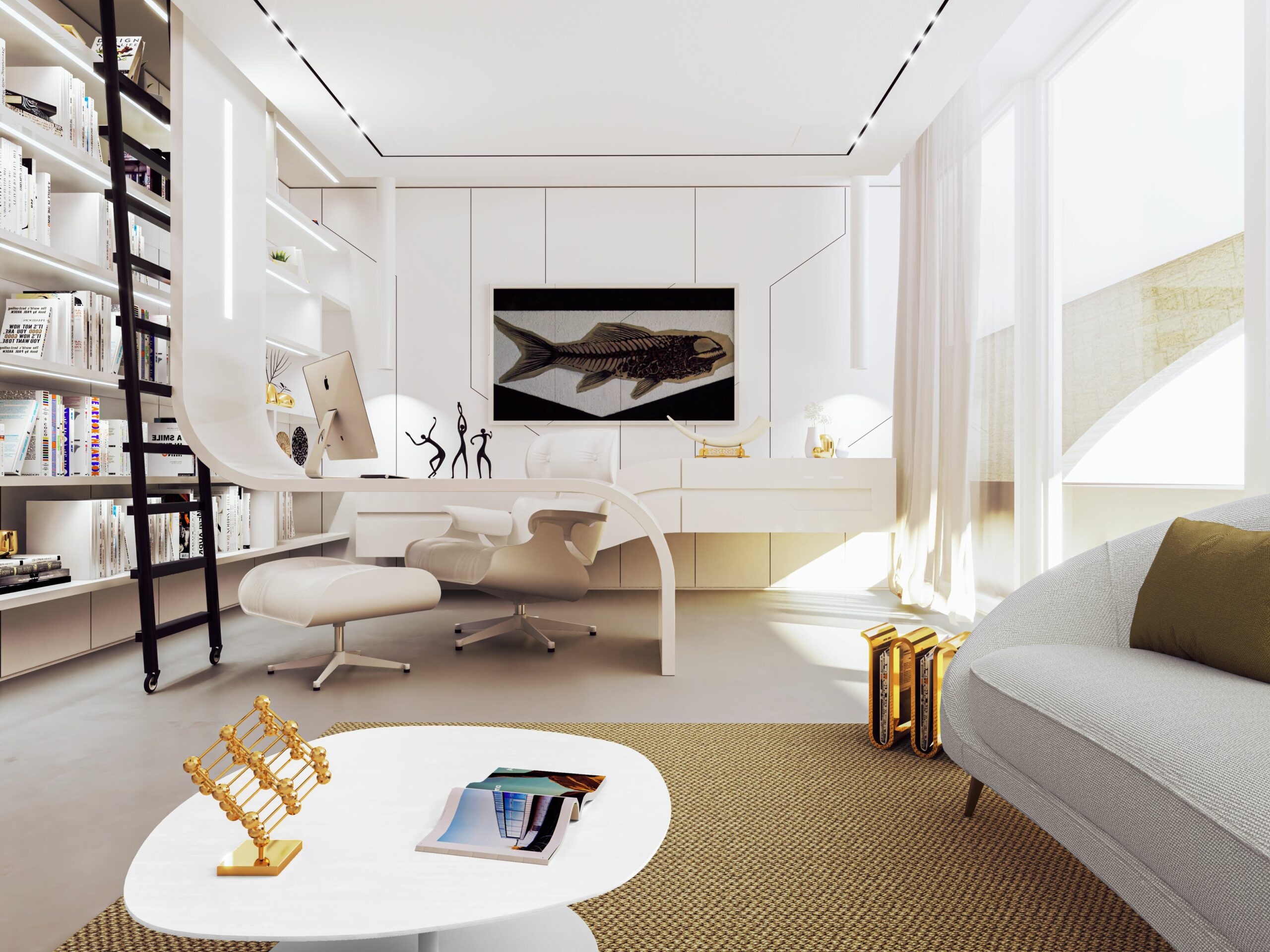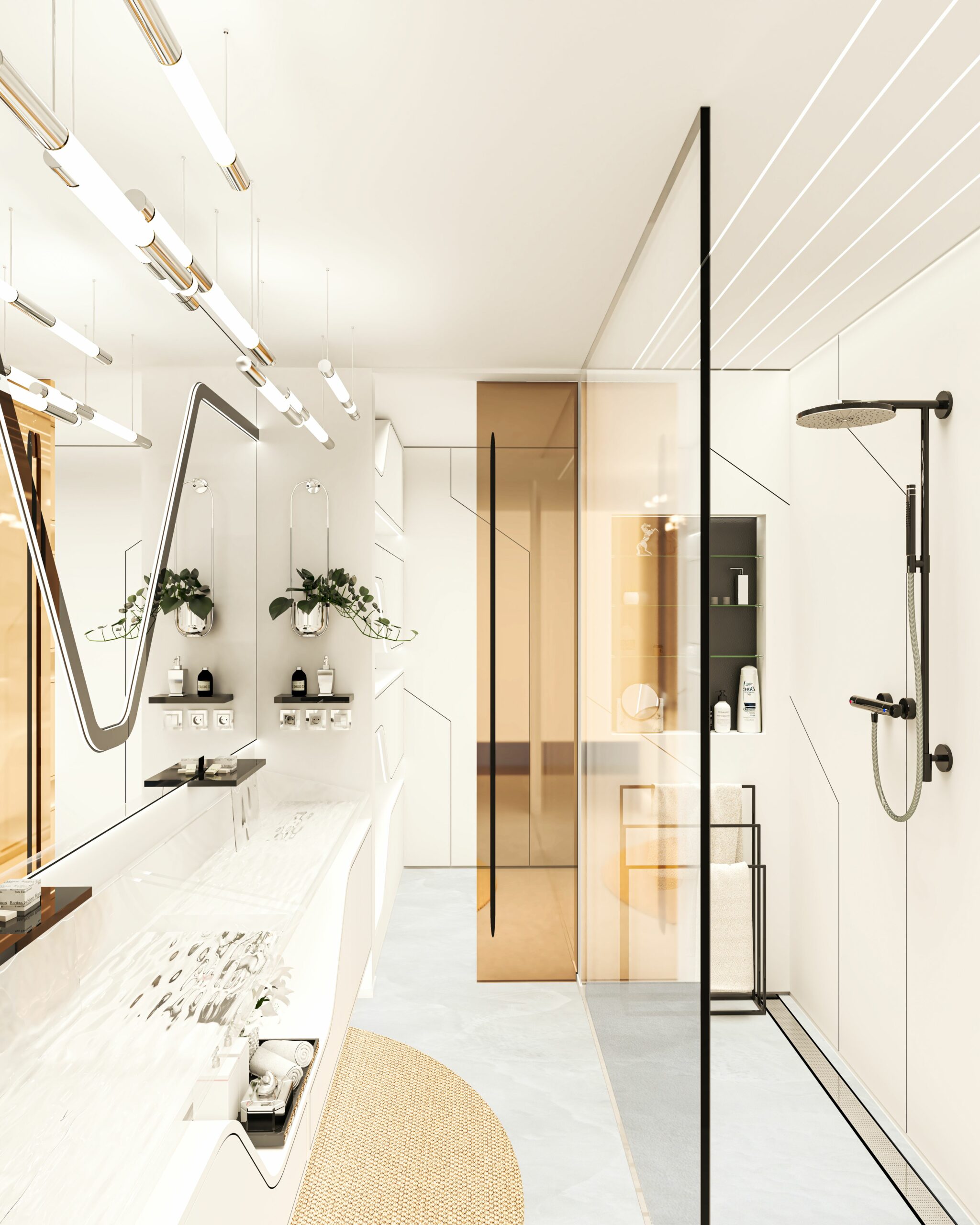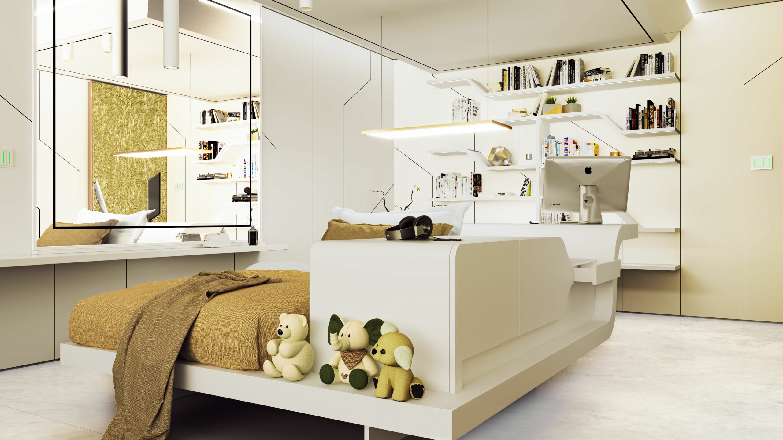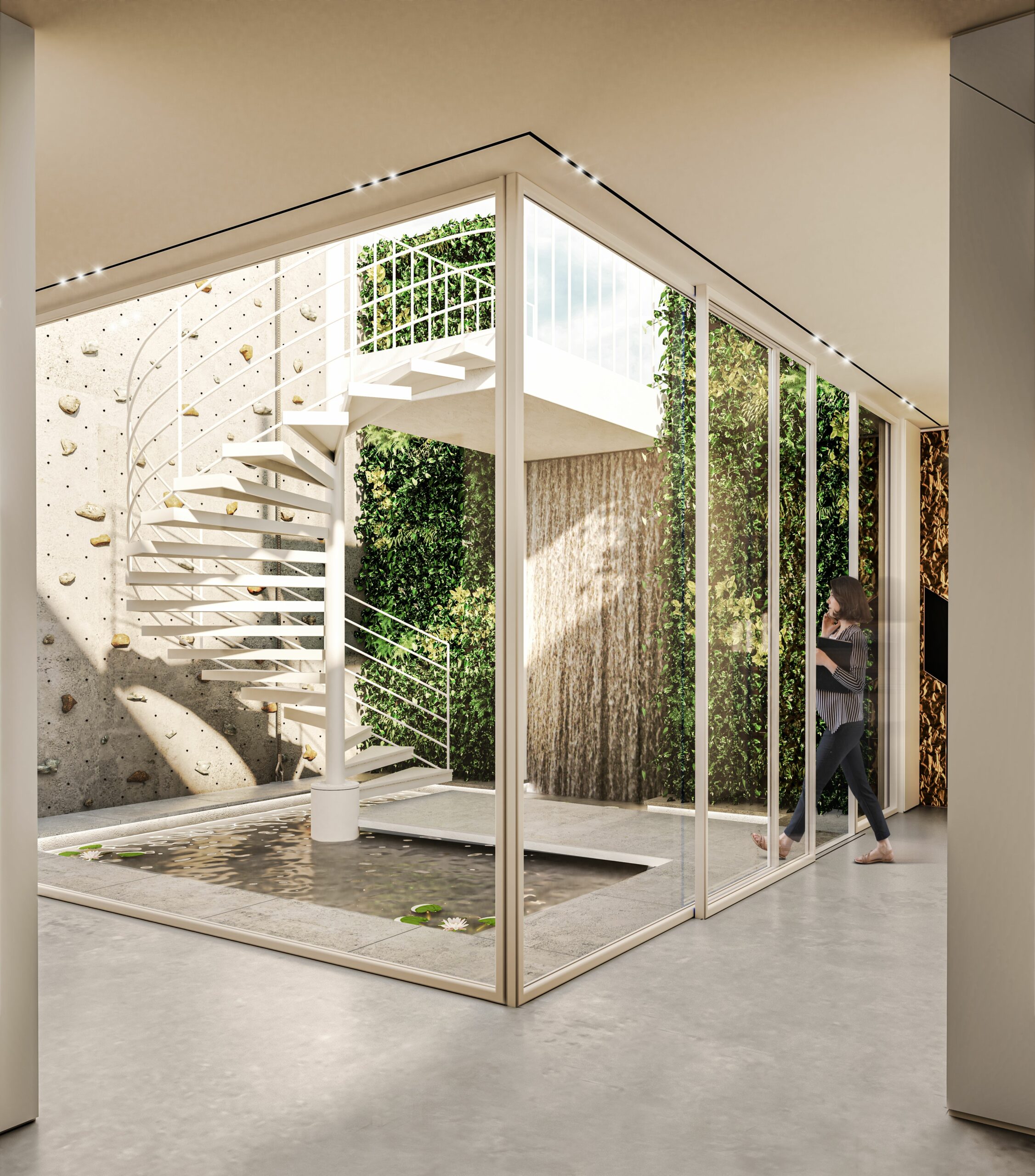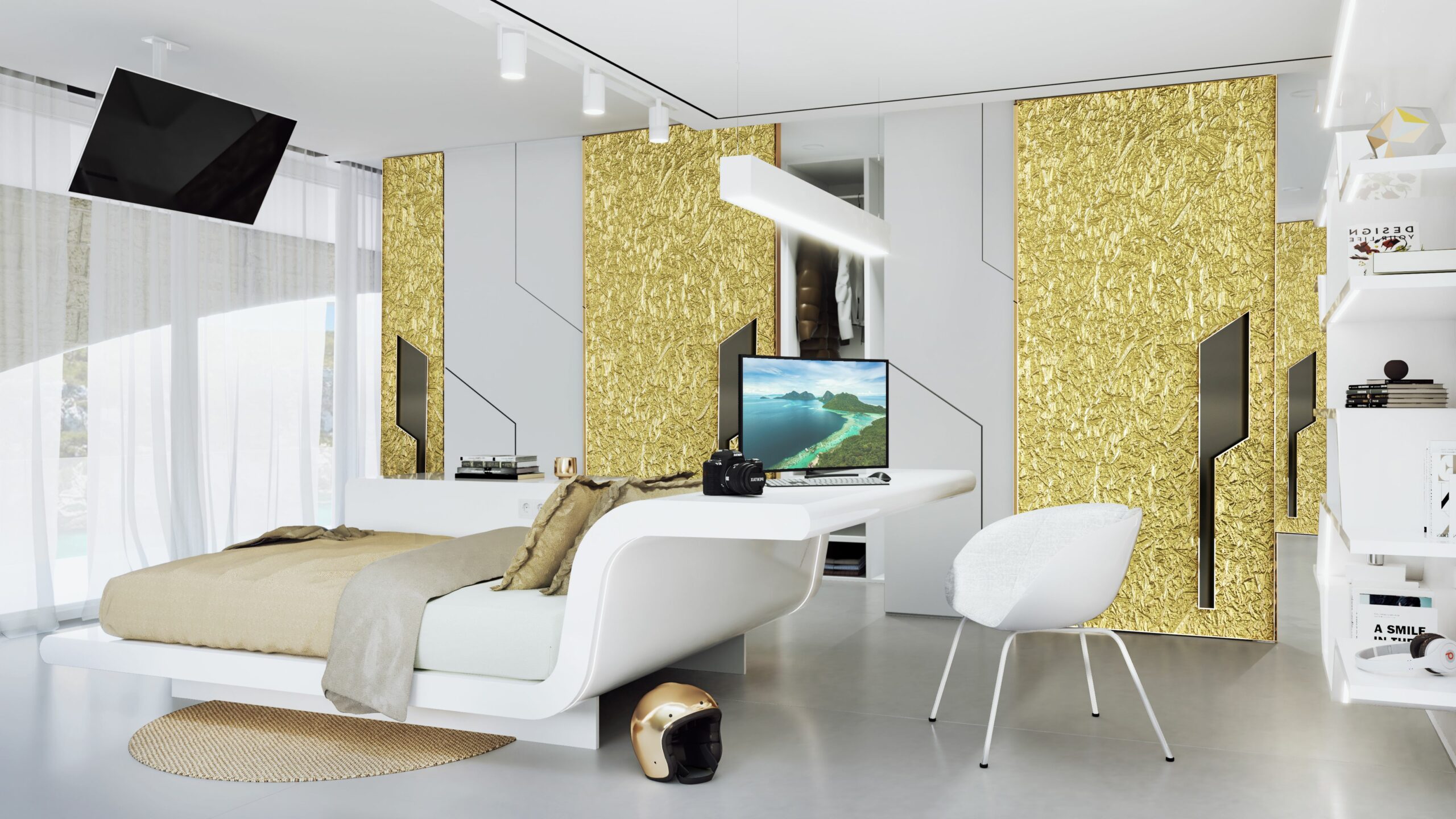 Gli interni sono caratterizzati da linee pulite e minimaliste, con pavimenti in resina e mobili di forme futuristiche.