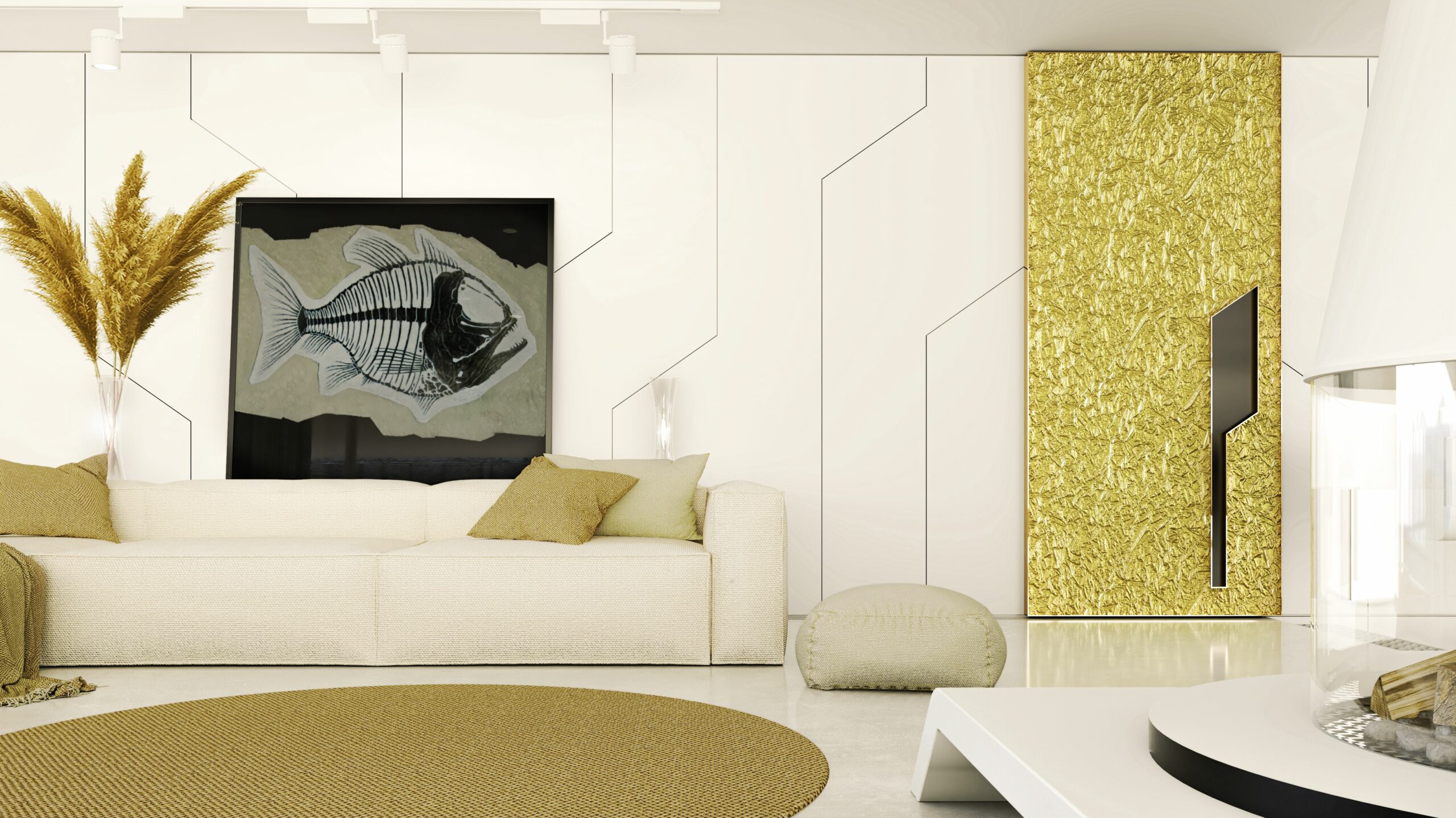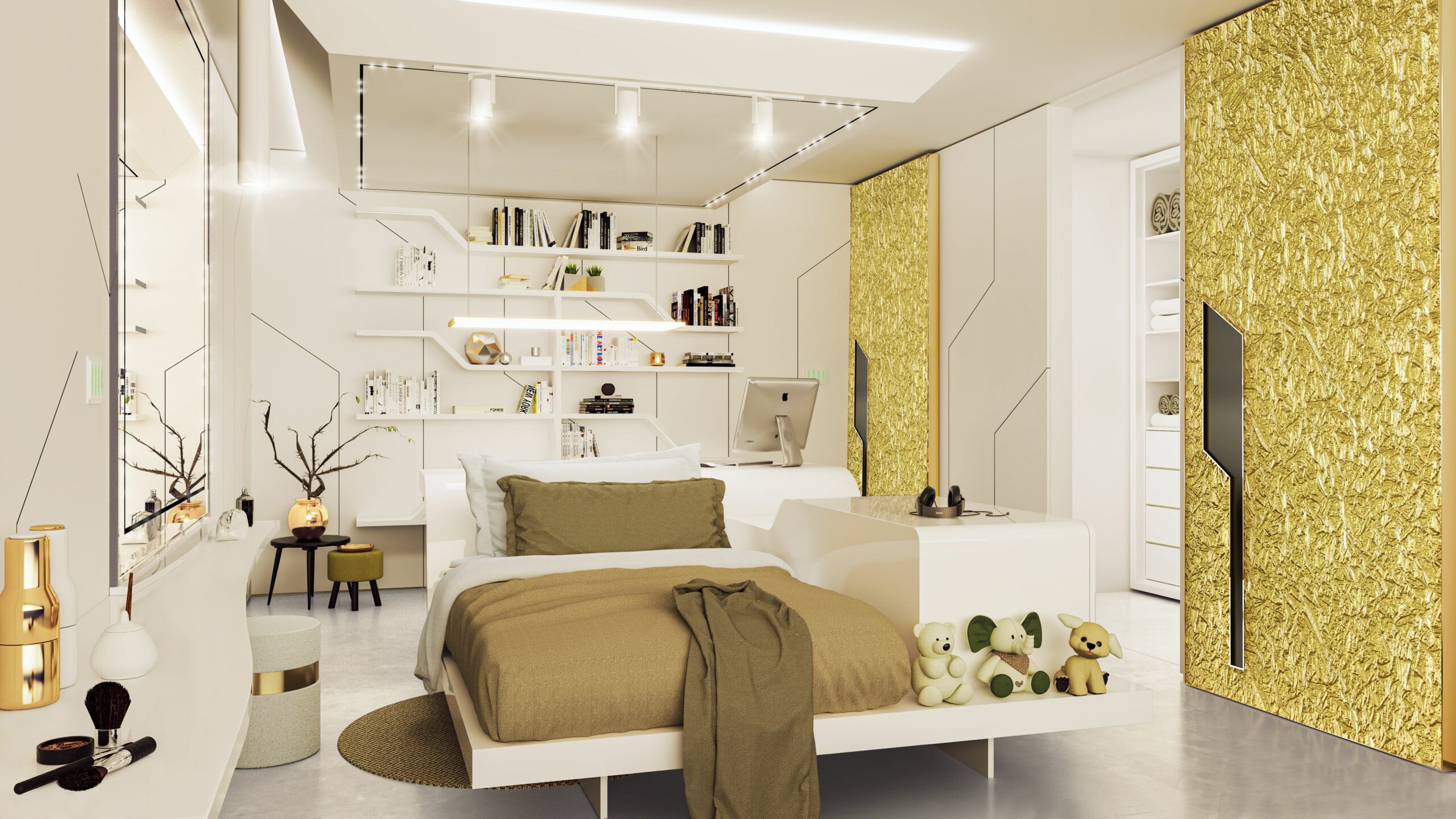 Porte scorrevoli con superfici scolpite in finitura metallica dorata aggiungono un tocco di lusso e sofisticatezza.